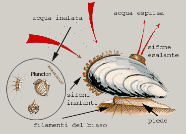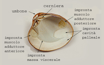 ![]() Noti anche come pelecipodi, i Bivalvi comprendono circa 20000 specie distribuite sia in acque marine che in acque dolci di tutto il mondo. Le dimensioni di questi Molluschi variano fra il millimetro e oltre un metro (Tridacna gigas). Sono caratterizzati dall'avere una conchiglia formata da due valve, secrete da un mantello che avvolge entrambi i lati del corpo. Le valve sono tenute assieme da un legamento elastico, posto sul margine dorsale della conchiglia, e sono collegate da uno o da due muscoli adduttori. Il loro corpo è compresso lateralmente. Cavità palleale ampia, quasi sempre provvista di due branchie spesso di aspetto laminare (da qui il nome di Lamellibranchi). Il capo è assente.